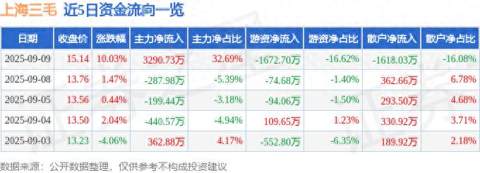 9月9日的资金流向数据方面,主力资金净流入3290.73万元,占总成交额32.69%,游资资金净流出1672.7万元,占总成交额16.62%,散户资金净流出1618.03万元,占总成交额16.08%。
