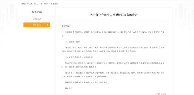 12月13日,中国农业银行在官网发文称,自2024年12月13日起,优化升级个人外币钞汇服务,升级版服务的内容主要包括实施钞汇同价、对所有币种免收钞汇转换价差等。